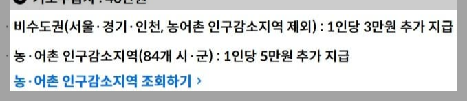 비수도권(서울. 경기. 인천. 농어촌감소지역제외): 1인당  3만원 추가 지급
